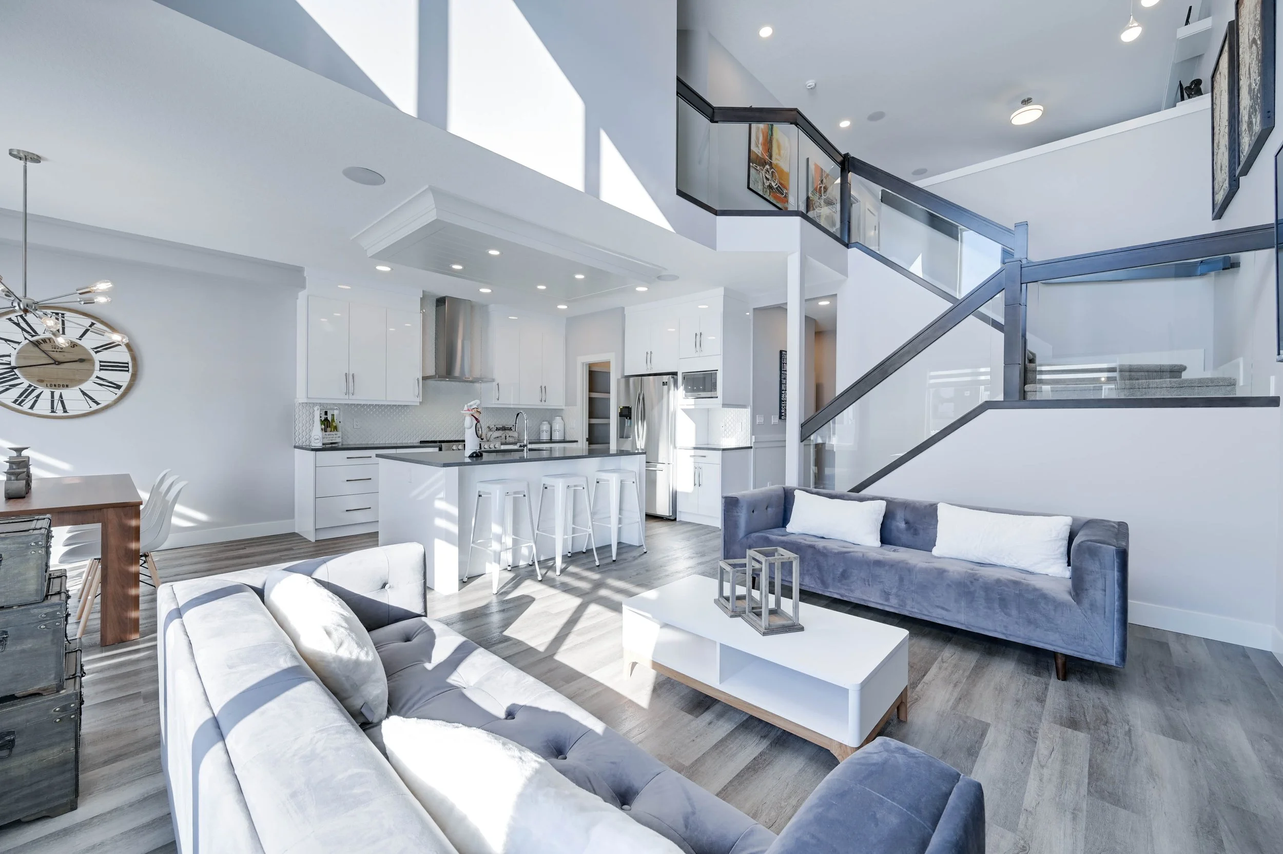 The Great Room features 18-feet high ceilings and a 60-inch electric fireplace with stunning triple pane windows.