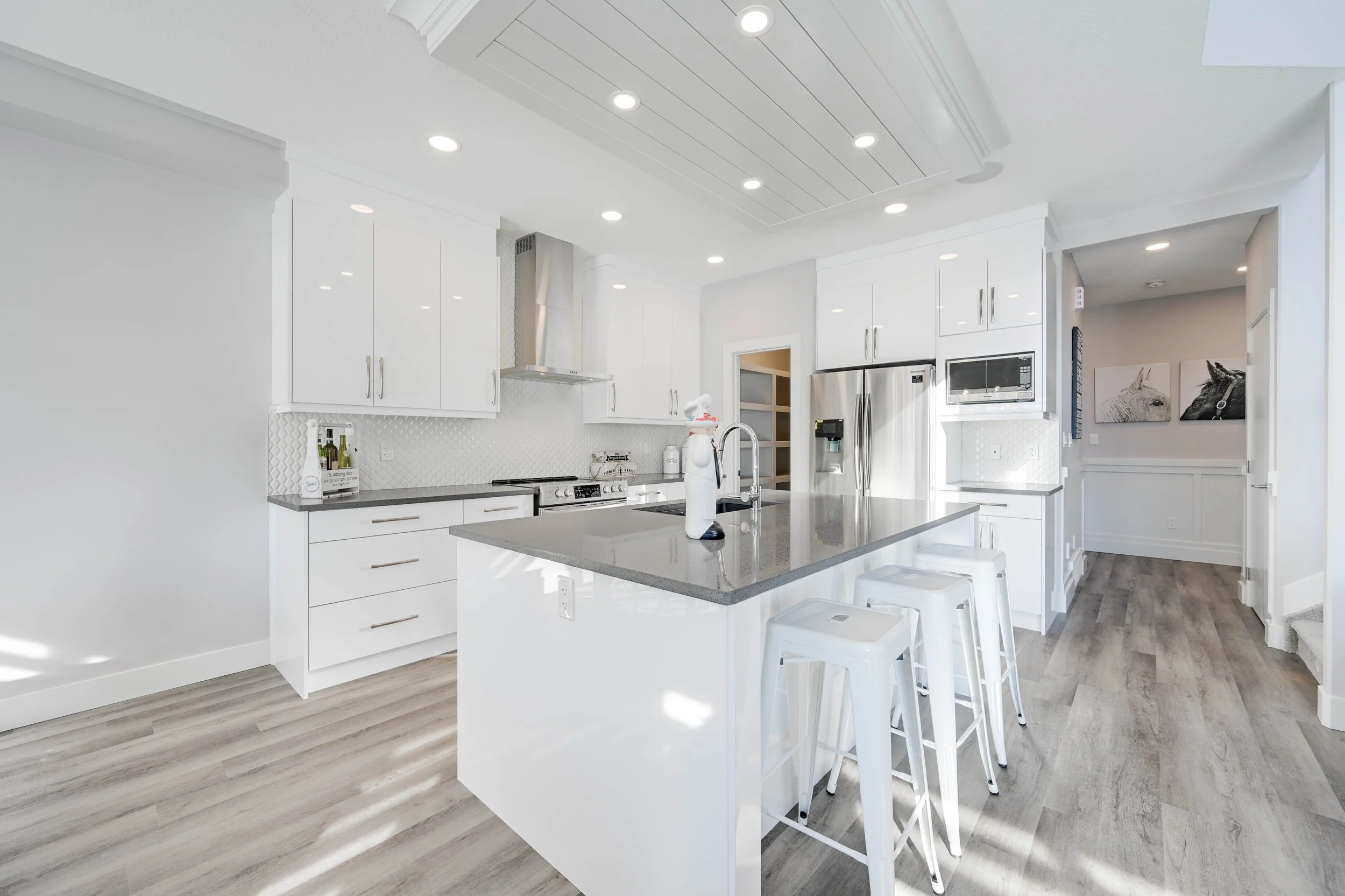 The Kitchen showcases stainless steel appliances, quartz countertops, to-the-ceiling soft-closing cabinetry, large island, and walk-through Pantry with MDF shelving.